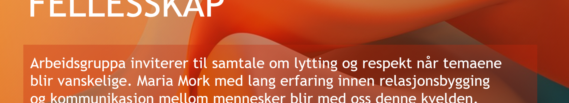 Arbeidsgruppa "Ærlig og inkluderende fellesskap" inviterer til andre samtalekveld torsdag 29. januar. Denne kvelden har vi med oss Maria Mork (Partolken) som vil innlede til samtale om kommunikasjon når temaene blir vanskelige.